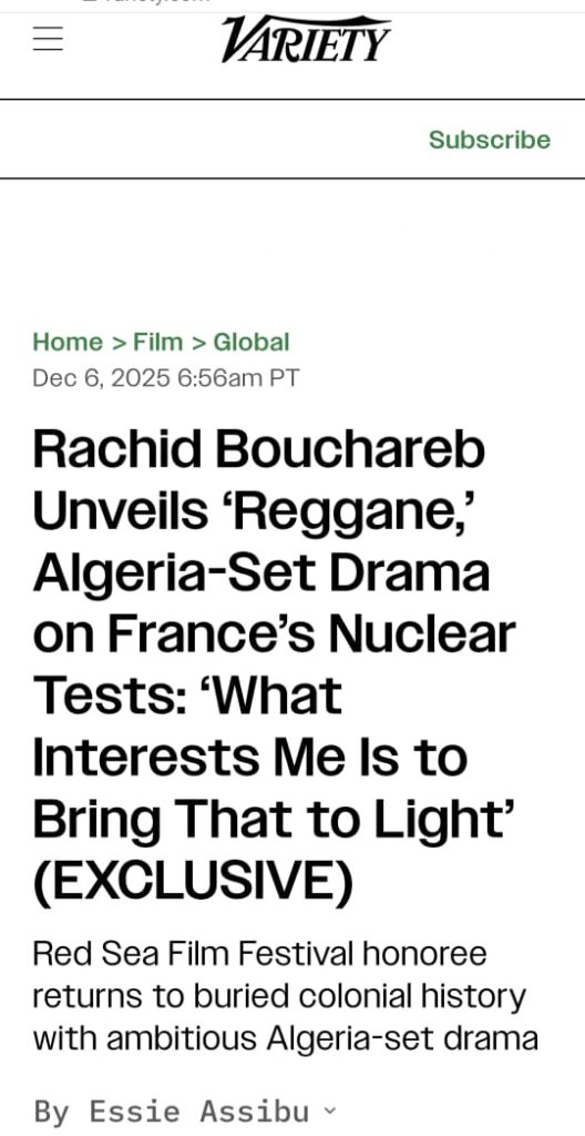 À peine trois jours après la publication de cet article, le site britannique Deadline, principal concurrent de Variety, apporte de nouvelles précisions sur le film : « Des producteurs américains et japonais en pourparlers pour le film Reggane, un drame sur les essais nucléaires français, réalisé par Rachid Bouchareb et financé majoritairement par l’Algérie », titre Deadline.