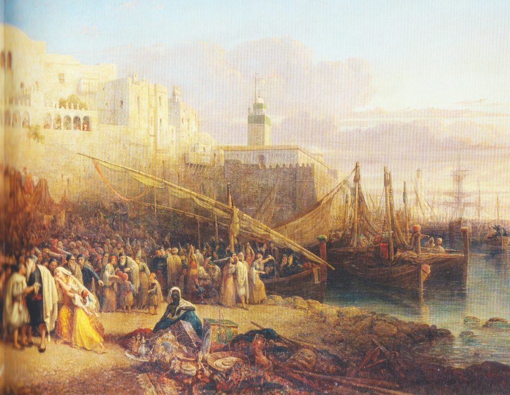 Peinte par l’artiste britannique William Wyld, cette toile représente le départ d’Algériens — juifs et musulmans — en 1830, fuyant l’avancée des troupes françaises vers la Palestine. À travers cette scène d’exil, Wyld saisit l’un des premiers bouleversements humains provoqués par la conquête coloniale de l’Algérie.